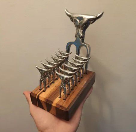Garfo Tridente + 12 Garfinhos Petisco + Base Madeira de Lei